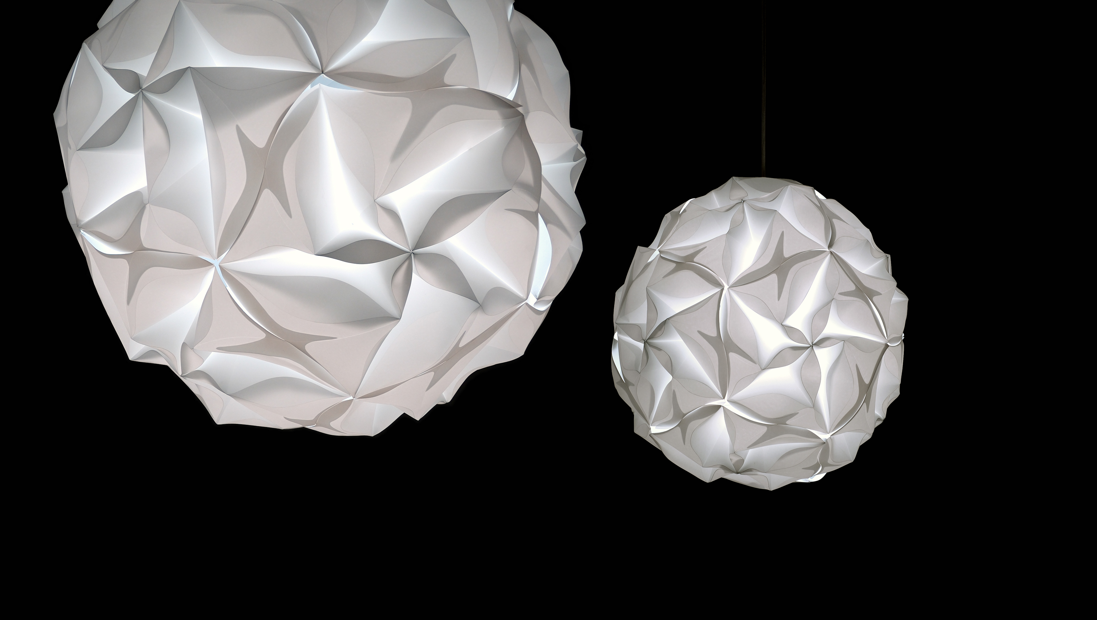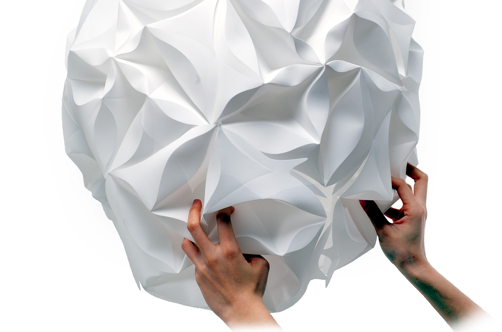 A sheet of plastic is folded to create a pentagon-shaped piece. Twelve of these pieces are combined to create a spherical light.
